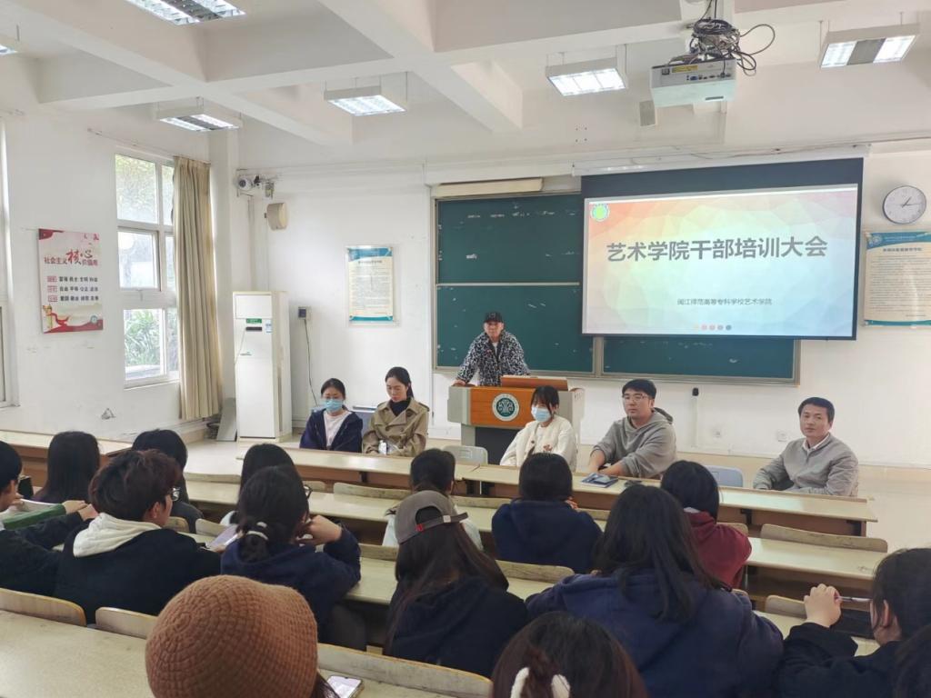 为提高学院学生干部工作能力,增强责任感与使命感,组建一支工作高效、团队协作、树立典范的学生干部队伍,11月16日下午,艺术学院召开两委学生会干部培训大会。本次培训对象为艺术学院两委学生会各部门负责人、各班级班长、团支书等学生骨干。会议由艺术学院团委书记周宇航主持,艺术学院副院长陈洪翔,艺术学院辅导员沈锦城老师、林惠楠老师、张琦榕老师、邓悦老师出席此次会议。