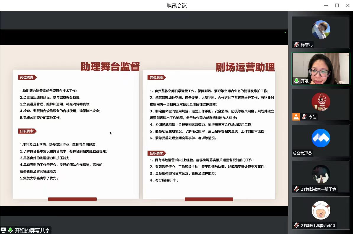 本次线上招聘会以“岁寒情暖,职引未来”为主题,采用企业线上宣讲+在线投递简历+视频面试的方式,旨在进一步深化校企合作,促进毕业生高质量就业。舞蹈教研室主任李佳率全体教研室老师参与并进行线上指导,舞教专业毕业生全员参与。