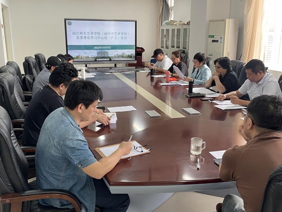 2024年10月9日上午,艺术学院党委理论学习中心组在旗山校区第三会议室召开(扩大)学习会,传达学习习近平总书记近期重要讲话精神,并围绕习近平同志《论教育》和全国教育大会精神展开专题研讨。会议由党委书记江柳青主持,艺术学院党委理论学习中心组成员及中层以上干部参加。