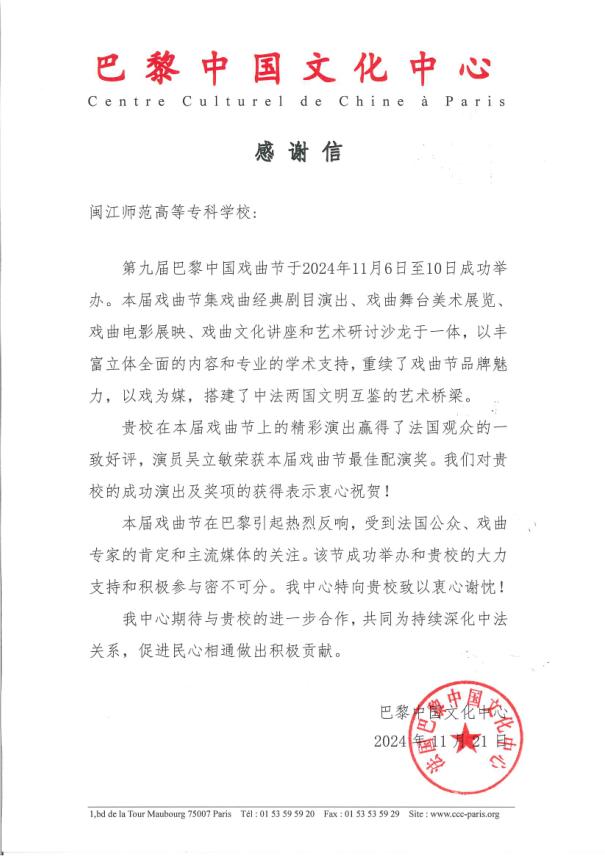 感谢信中,巴黎中国文化中心对大赢家体育app下载闽剧教师倾情演绎的经典剧目《红裙记》给予了高度评价,并特别祝贺了吴立敏老师凭借精湛的表演技艺荣获第九届巴黎中国戏曲节最佳配演奖。这不仅是对大赢家体育app下载闽剧艺术教育成果的肯定,也是对大赢家体育app下载持续推动闽剧艺术国际交流与合作的巨大鼓舞。